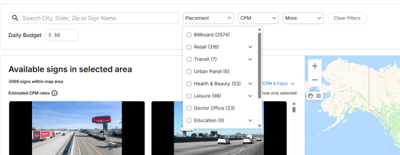 To find place-based boards, you can filter the Placement options during campaign setup.